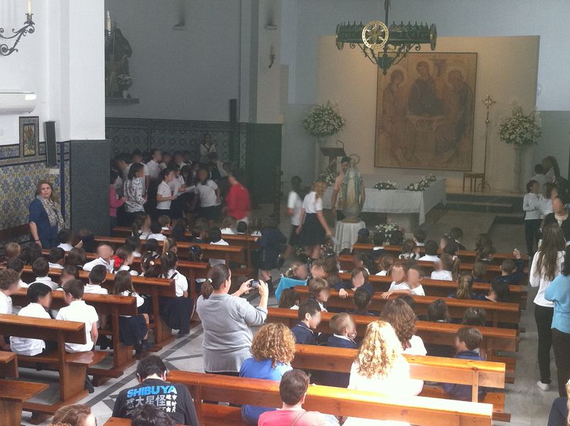 Los alumnos de nuestro Colegio Parroquial en este mes de Maria le han ofrecido flores, dibujos, peticiones, acciones de gracias y canciones. Maria se lo merece todo. Especialmente ha sido muy entrañable los cantos de los pequeños de infantil. Que Maria Santisima los lleve siempre de la mano y los proteja con el rocio de su intercesión.